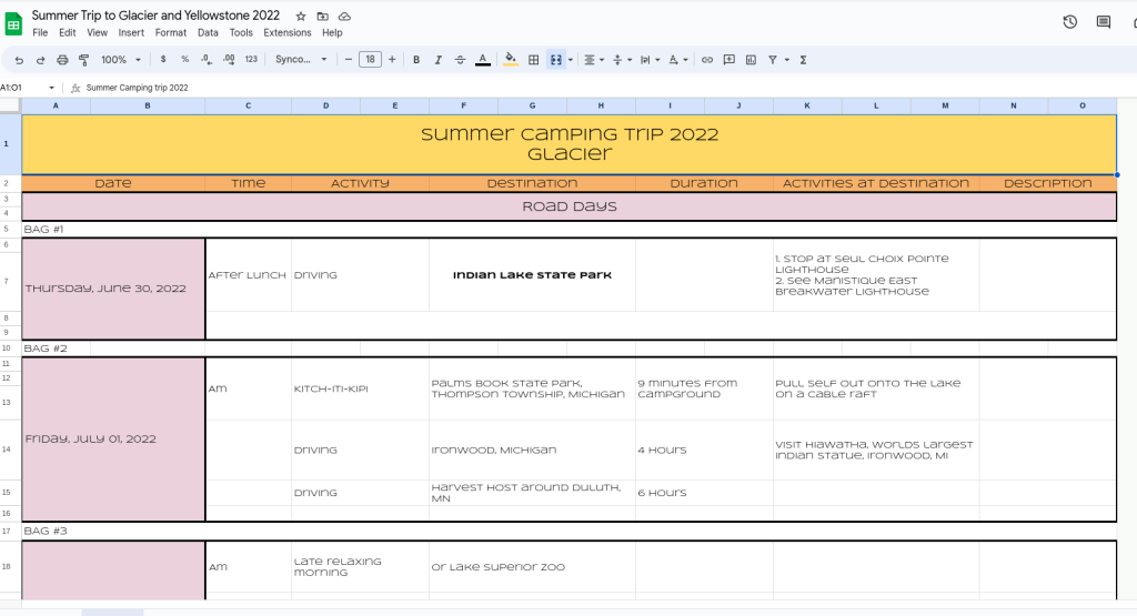 To keep our road trip organized and easily accessible, we use Google Sheets to create a daily itinerary. This allows you to easily see and manage your plans. If you have the time, you can also create a document in Google Docs that outlines your route and schedule for each day. By having a well-organized itinerary, you can stay on track and ensure that you don’t miss out on any of the experiences you’ve planned for.